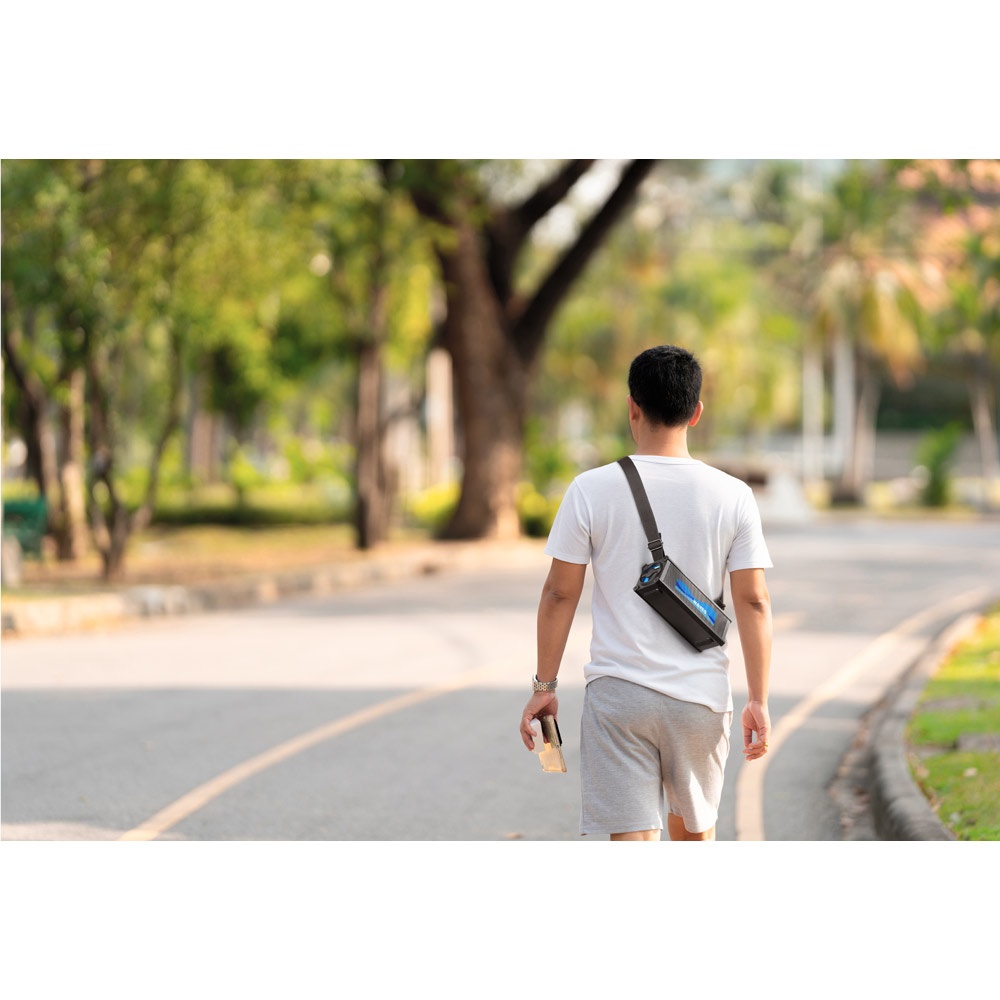 Portable speaker with a carrying and storage strap that can be adjusted to your body or used as a short handle. The battery has an autonomy of approximately 5 hours and allows you to charge other devices.Material: ABSWireless transmission: BT v5'0Input: USB-A, AUX 3'5 mm and USB-CSound power: 16W (2x 8W)Capacity: 3.000 mAhOutput: USB-A and AUX 3'5 mmFeatures: control the volume and playlist of the mobile deviceIncludes: USB-C charging cable and 3'5 mm audioFully customisable grilleDelivery: White gift box 250 x 100 x 90 mm